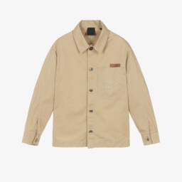 Blue striped shirt for boys by luxury brand Givenchy, made in lightweight cotton seersucker. Cool and easy wearing, it is patterned with yellow seashells. There is a black embroidered logo on the chest and branded button fastenings on the front.