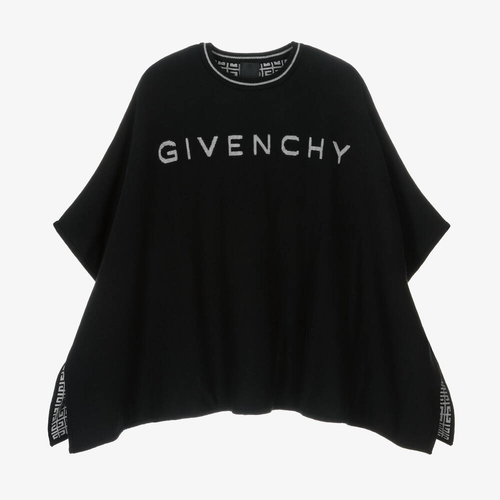 A reversible black and grey cape for girls by French brand Givenchy, knitted in a luxuriously soft cotton and cashmere blend. Offering two stylish looks in one, the black side features a grey intarsia logo on the front and a large 4G motif on the back. The reverse is patterned with 4G logos for an unmistakable designer look. It has a ribbed neckline with a contrast stripe and simply slips over the head for cosy coverage.