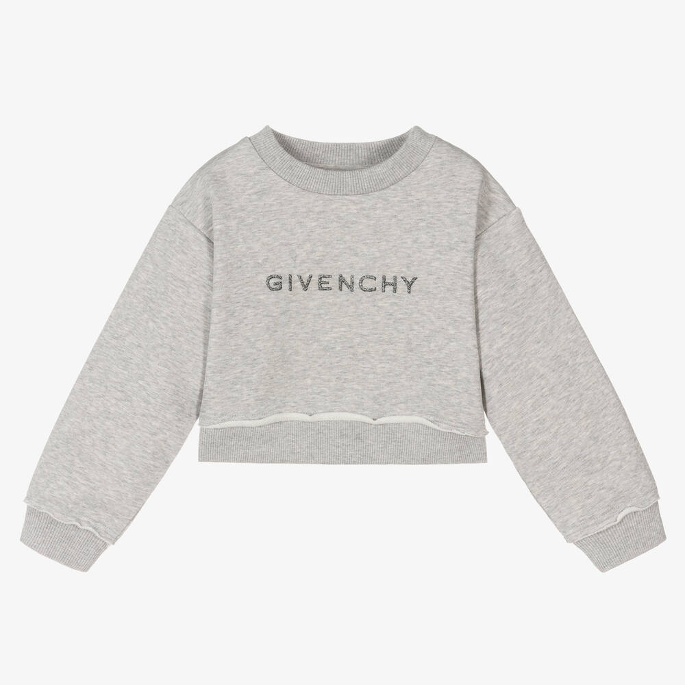 Grey marl sweatshirt for girls by luxury French designer Givenchy, made in mid-weight cotton jersey with a fleecy inside. Ideal for casual wear, this cropped style has a sparkling logo across the front and a 4G logo on the back, both embroidered in glittery thread. It is designed for a boxy fit and has raw-edged trims above the cuffs and hemline for a distressed finish.