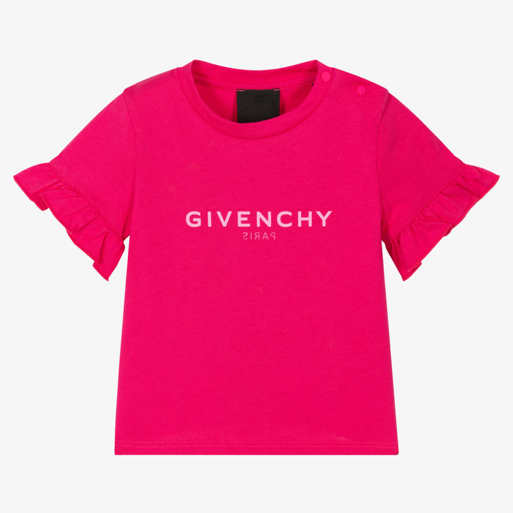 Fuchsia pink T-shirt for little girls from Givenchy, made in soft cotton jersey with cute frilled trim on the sleeves. This stylish tee has a pale pink Givenchy Reverse logo print on both sides, with a small 4G logo on the back hem. There are branded popper fastenings on one shoulder for easy dressing.