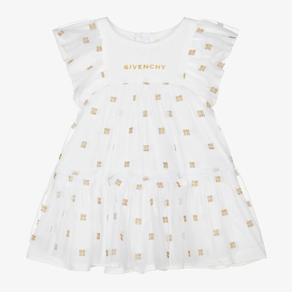A gorgeous white dress for little girls by luxury French brand Givenchy, ideal for any special occasion. Distinctly by the designer, the iconic 4G logo is embroidered in gold on the sheer tulle overlay, with golden 'Givenchy' embroidery on the bodice adding a signature finish. Fully lined in soft cotton for ultimate comfort, this lovely dress has pretty flutter sleeves and a concealed zip fastening on the back for a neat finish.