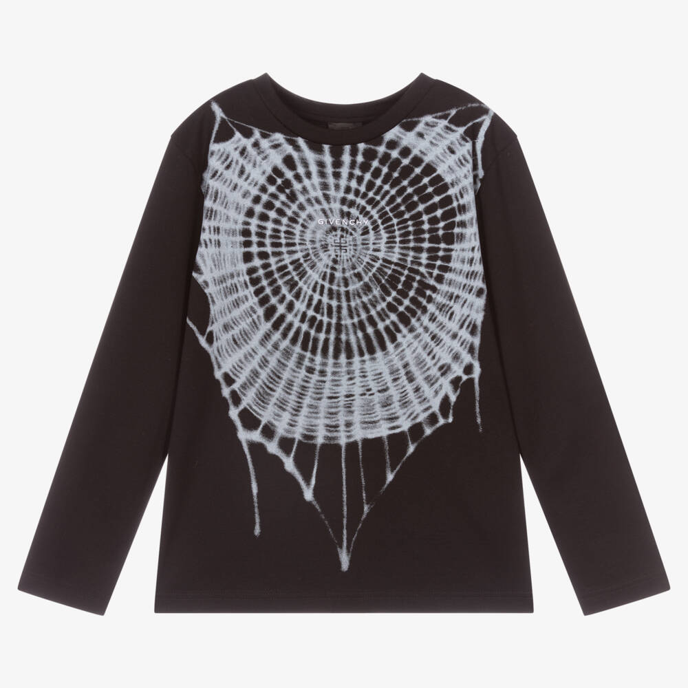 Black top for teen boys by luxury designer Givenchy. As seen in the adult collection, there are grey spider web graphics on the front and back, with white embroidered branding and a 4G logo print on the front. This comfortable top is made in soft and stretchy cotton jersey for cool and comfortable wear.