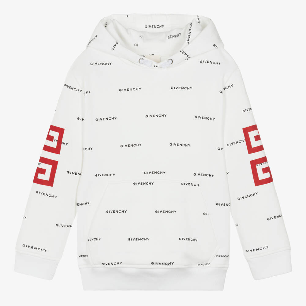 Casual and cool white hoodie for teen boys by Givenchy, the luxury French fashion house. Instantly recognisable logos can be found across this long-sleeved style, with bold 4G logos printed on each sleeve in stand-out red shades. For relaxed comfort, it is made in soft cotton jersey.