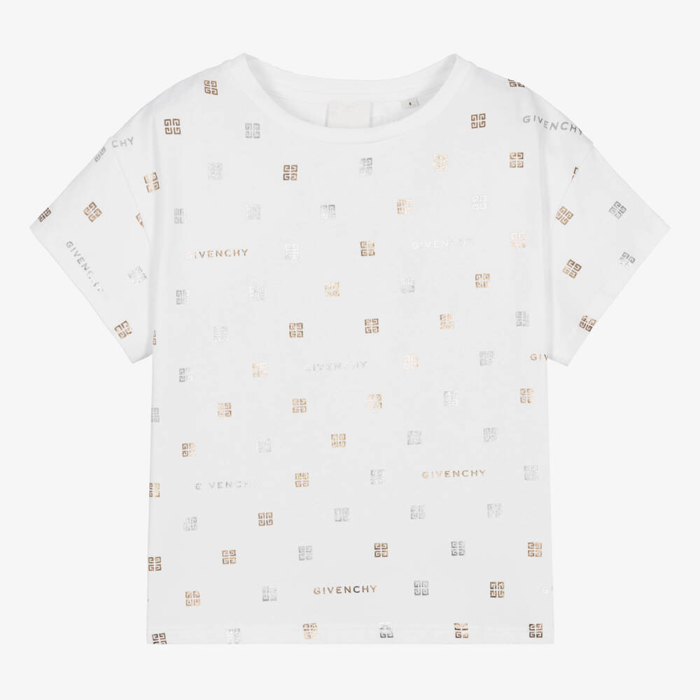 White cotton T-shirt for teen girls by luxury French designer, Givenchy. It is patterned all over in spell-out and 4G logos in silver and gold print, catching the light beautifully. Made in soft and comfortable cotton jersey, this casual short-sleeved tee has a relaxed boxy fit.