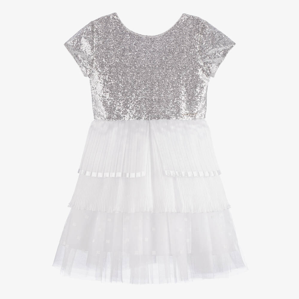 Glittering in silver sequins, this luxurious white dress for teen girls is from French fashion house, Givenchy. A silver logo charm is featured on the waist, with the signature 4G logo embroidered on the tulle hem. The silky chiffon skirt is elegantly pleated with a satin ribbon trim, making it exquisite for special occasions. A silver logo-embossed zip fastening and soft cotton lining complete the look.