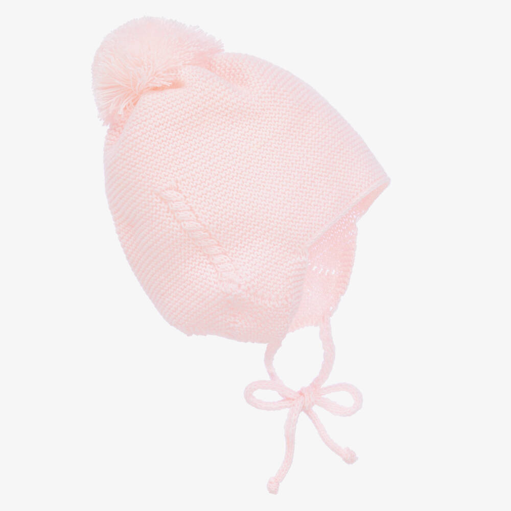 Lovely pale pink knitted hat for baby girls from Spanish label Gorros Navarro. Soft and cosy, it is designed with delicate cable stitching on the sides, a pom-pom on the top, and ties to fasten under their little chin.