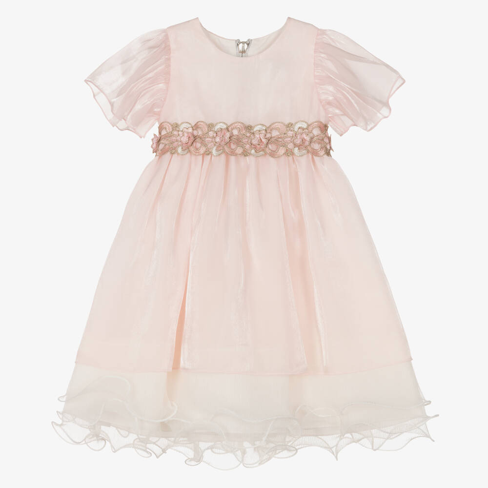 A pale pink dress for little girls by Spanish brand Graci, made from silky soft organza with a beautiful sheen. Ideal for special occasions, this pretty design has sheer flutter sleeves and embroidered floral detailing on the waistline. It has a comfortable, rounded neckline and an exposed silver zip on the back. The white base fabric has a lightweight tulle trim with a layered, curved edge. This can be seen below the hem for added movement and texture. Lightweight cotton voile lines the dress for added comfort.