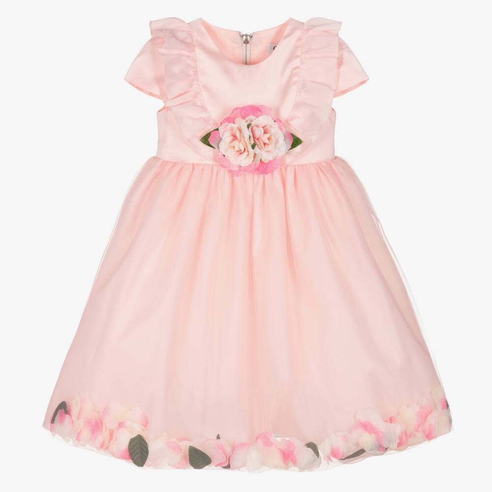 Delightful for special occasions, this light pink dress for girls is by luxury brand, Graci. Blooming with volume, the tulle skirt has artificial petals inside for a pretty look. The cotton voile bodice has ruffled trims, pairing beautifully with a removable floral brooch. It fastens with a zip at the back, and has a soft voile lining, with a tulle attachment.