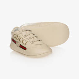 Beige and green Mini-me pre-walker Screener sneakers for baby boys and girls by luxury Italian brand Gucci. Made in soft and supple leather, they have GG canvas panels with green and red Web trims. They have soft leather lining, lightly padded insole, smooth leather outsole and laces to fasten. There is a gold logo print on heel and a gold and silver metal Double G logo on the front.