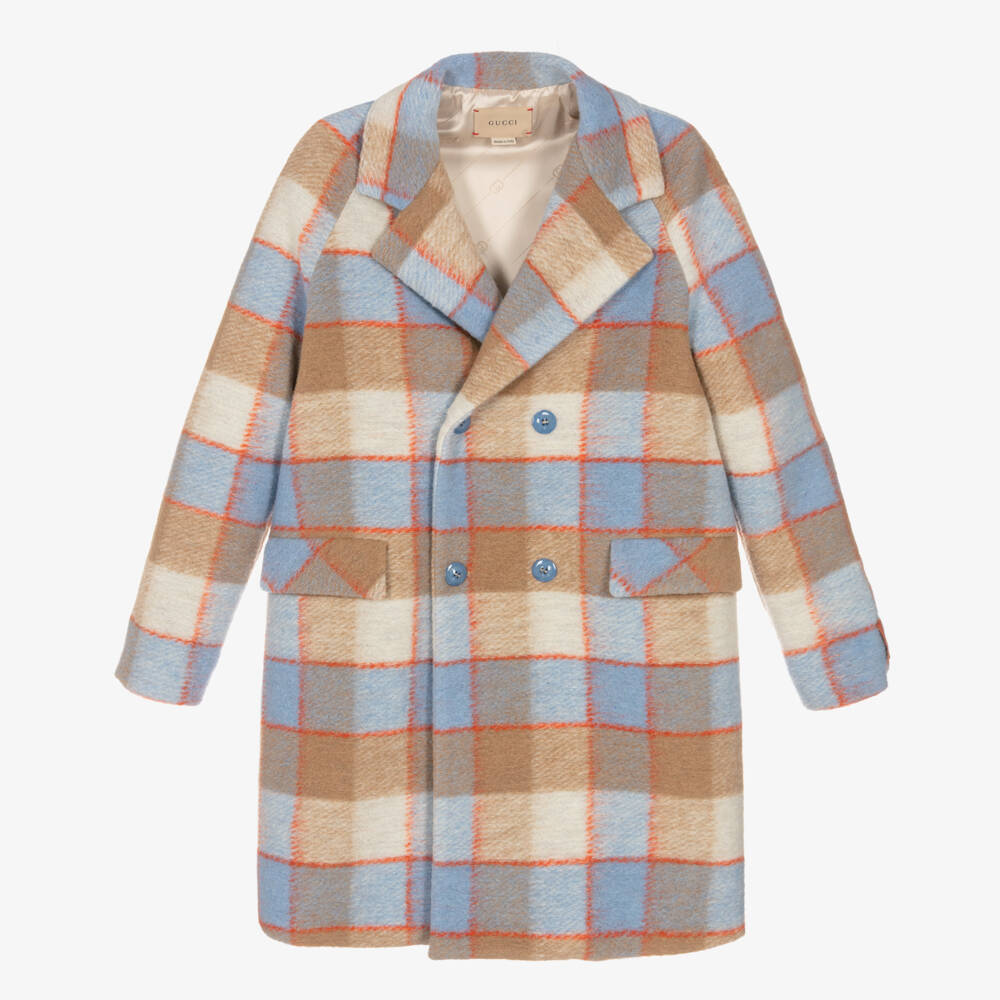 A classic blue and beige check coat for teen boys by luxury Italian brand Gucci, in collaboration with vintage clothing collector Angela Lynne. This stylish outerwear piece is made from thick brushed wool for ultimate cosiness and comfort. A double-breasted style, it fastens with branded blue buttons on the front and has flap pocket detailing for a traditional look. Adding subtle yet distinctive designer touches, the silky satin lining is patterned in the signature Interlocking G logo, with an orange logo label sewn onto one sleeve.