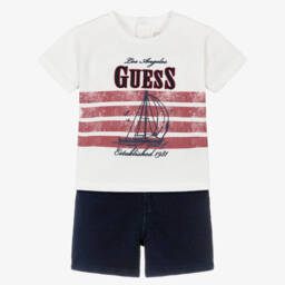 Yellow and dark blue shorts set for baby boys by Guess. Patterned in a fun tropical island print, the T-shirt has the designer's signature Triangle logo on the front, with shoulder poppers to help with dressing. The denim jersey shorts have a ribbed elasticated waist with a single popper at the front, finished with a small logo on the back pocket.