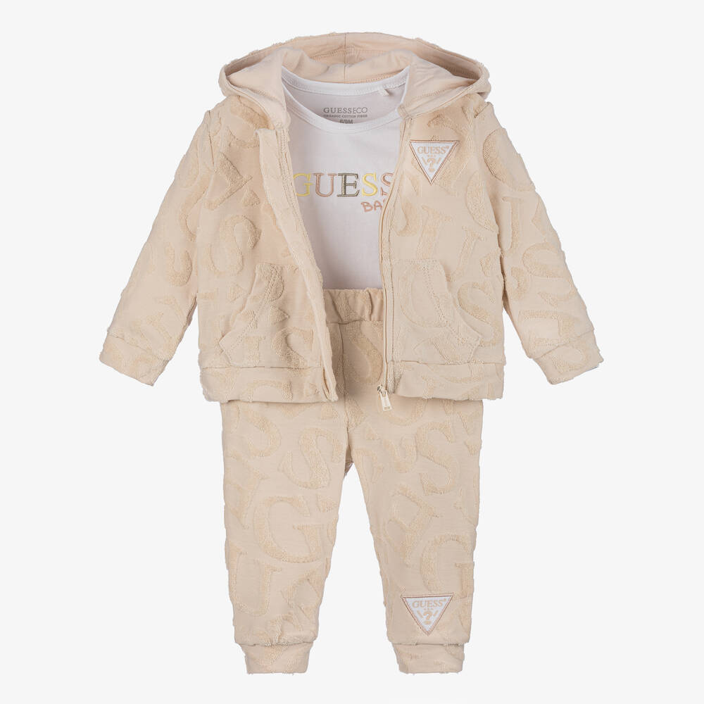 Light beige and white tracksuit set for baby girls by Guess, made in comfortable cotton jersey for casual dressing. The hooded zip-up top is textured with towelling logo letters. It has a Triangle logo on the chest and a protective zip guard under the chin. The matching joggers have an elasticated waistband for added comfort. To be worn underneath, the long-sleeved bodyvest has an envelope neckline and letters embroidered across the chest in yellow, beige and green. This item contains organic cotton fibres.