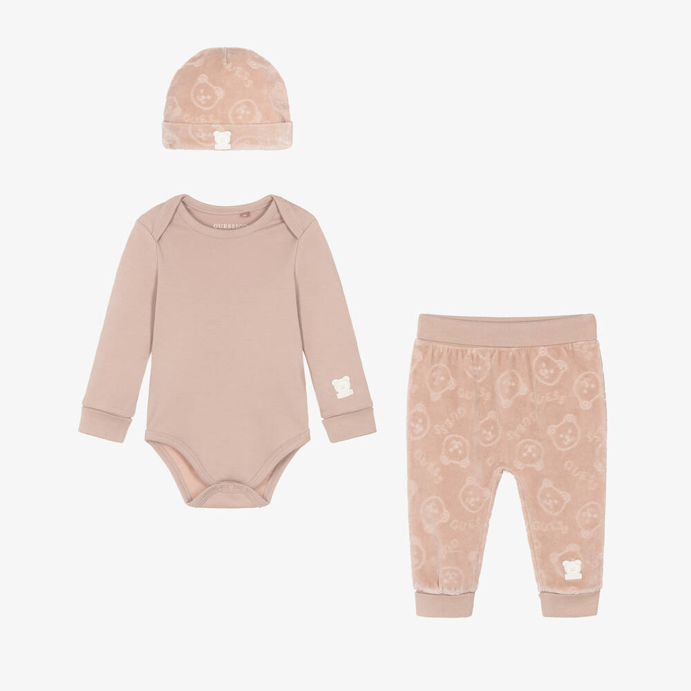 Dusky pink cotton outfit set for baby girls from Guess, comprising a bodysuit, trousers and hat, all featuring an ivory teddy logo patch. The soft jersey bodysuit has a comfortable envelope neck and poppers between the legs. It pairs with beautifully soft, velour jogger-style trousers, patterned with the designer's signature bears and logos, and trimmed with comfortable ribbing. A matching velour hat completes the set. Contains organic cotton fibre.