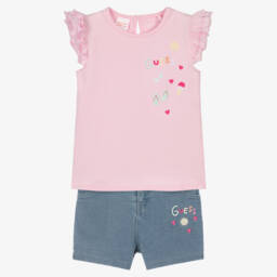 A white dummy and clip set for baby girls by Guess, with sweet pink teddy bear design. The set comprises a logo-branded dummy, a matching dummy clip and a storage case. Lovely for a new arrival, it is presented in a branded box.