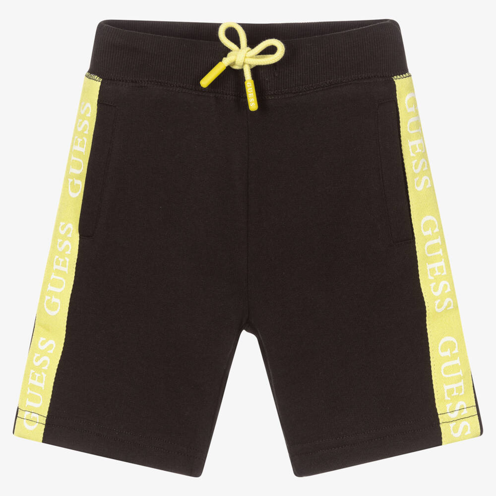 Black organic cotton shorts for younger boys by Guess, with pale green trims. Made with soft and stretchy sweatshirt jersey, there are useful front pockets and green logo tape on the sides. There is a branded drawstring on the elasticated waistband for a comfortable fit.