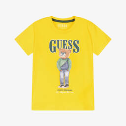 تيشيرت قطن جيرسي لون أصفر فاتح للأولاد الصغار من ماركة جيس، يتميز بطبعة دب أنيقة على الجهة الأمامية. يتميز هذا التيشيرت الكاجوال برقبة دائرية كلاسيكية وأكمام قصيرة، مع شعار أخضر بارز يضفي لمسة مميزة من هوية الماركة.