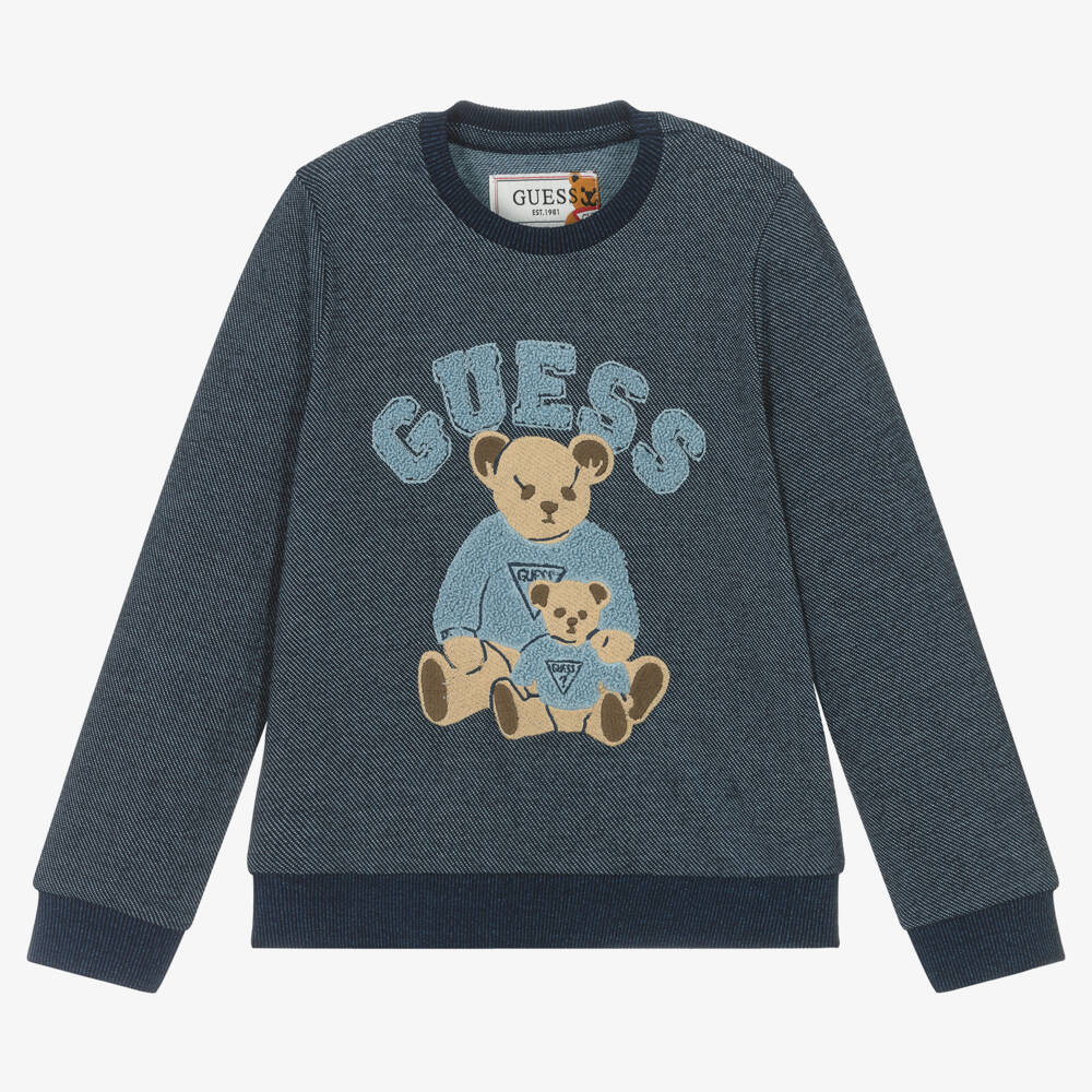 Navy blue sweatshirt for boys by Guess, made in soft cotton-rich jersey. Ideal for relaxed days, this casual top has a crew neck and lightly ribbed trims. There is a raised logo design on the front for added texture, along with embroidered beige teddy bear motifs. Smaller sizes have popper fastenings on the back for easy dressing.
