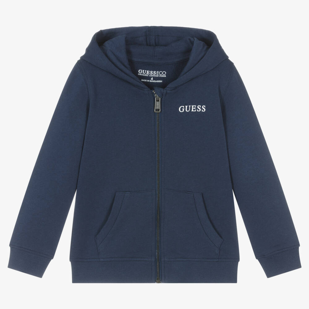 Navy blue cotton zip-up top for boys by Guess, printed with their famous triangular logo in red and white on the back, and an additional white brand name on the chest. Made in stretchy, mid-weight cotton jersey, this simple yet stylish top has front pockets, a fully lined hood for extra comfort, and fastens with an exposed branded zip. This item contains organic cotton fibres.