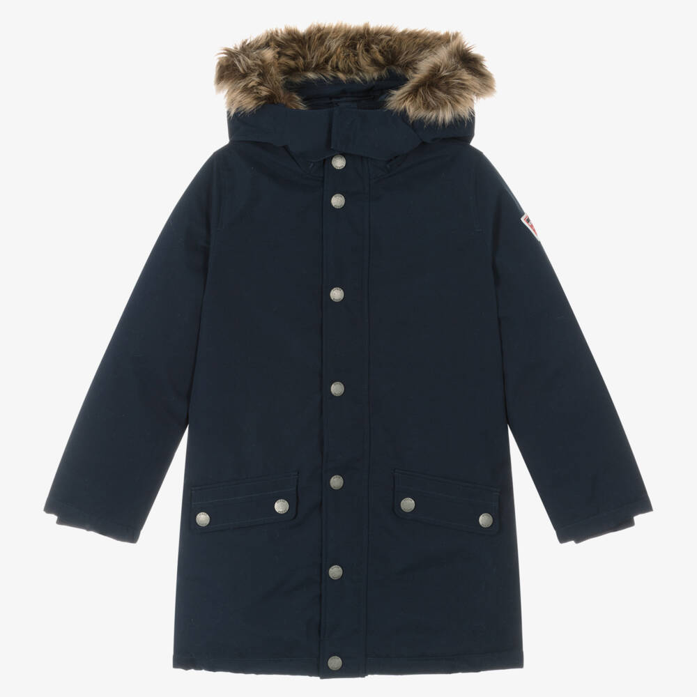 Navy blue parka coat for boys from Guess, made from super-soft fabric with a peached feel. Warmly padded with luxurious down, this cosy design has a removable hood and detachable faux fur trim, both fastening with easy-to-use zips. It has a silky, puffer-quilted lining, popper-closing front pockets and the iconic triangle logo patch on the sleeve. There are poppers on the back hem for freer movement and a velcro panel to fasten on the neckline for added protection from the elements. The cuffs are ribbed and the front zip is covered by a popper storm guard to help seal in warmth.