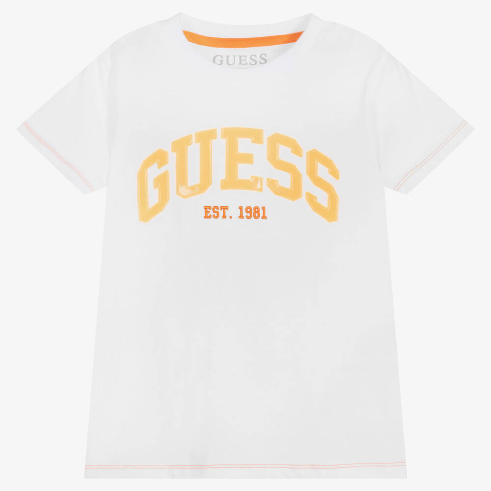 White cotton T-shirt for little boys by American brand Guess, made in comfortable jersey for relaxed days. It has the designer's shiny, rubberised orange logo on the front, with orange overstitching on the cuffs and hemline. This T-shirt contains in-conversion cotton fibre.