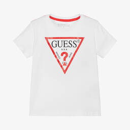 White T-shirt for younger boys by Guess, made in soft cotton jersey. Comfortable and casual, it features a playful take on the iconic Triangle logo with vibrant, raised rubber letters.