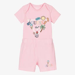 Casual and comfortable for younger boys, this yellow and dark blue shorts set is by Guess. The cotton T-shirt is patterned in a fun tropical island print, with the designer's signature Triangle logo on the front. The four-pocket denim jersey shorts have a ribbed elasticated waist with a single popper fastening at the front, and a small logo on the back pocket.