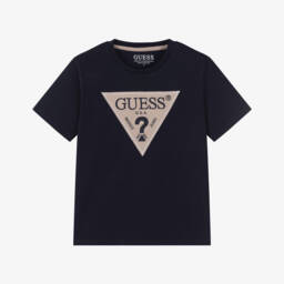 Casual navy blue T-shirt for younger girls by Guess. The front has a pretty pale pink and sparkly silver heart and logo design across the chest. Casual and comfortable, it is made in soft organic cotton jersey.