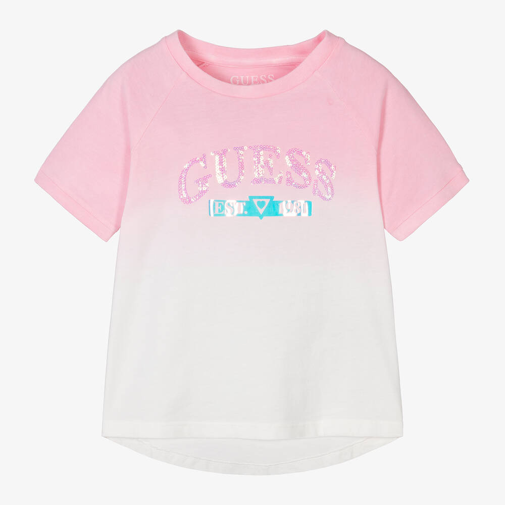 A pink and ivory short-sleeved T-shirt for girls by Guess, made from soft cotton jersey. It has a sequined logo and an iridescent Triangle motif on the front for a sparkly casual look, finished in a gradient effect. This item contains organic cotton fibres.