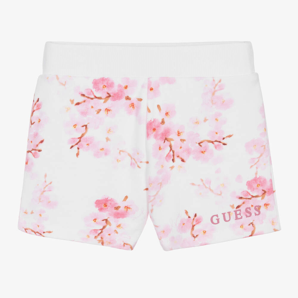 White shorts for girls by Guess, made in soft and stretchy cotton sweatshirt jersey. Cool and comfortable, they have a pretty pink cherry blossom pattern and a ribbed, elasticated waistband. There is a mauve purple rubber logo on one leg for a casual designer statement.