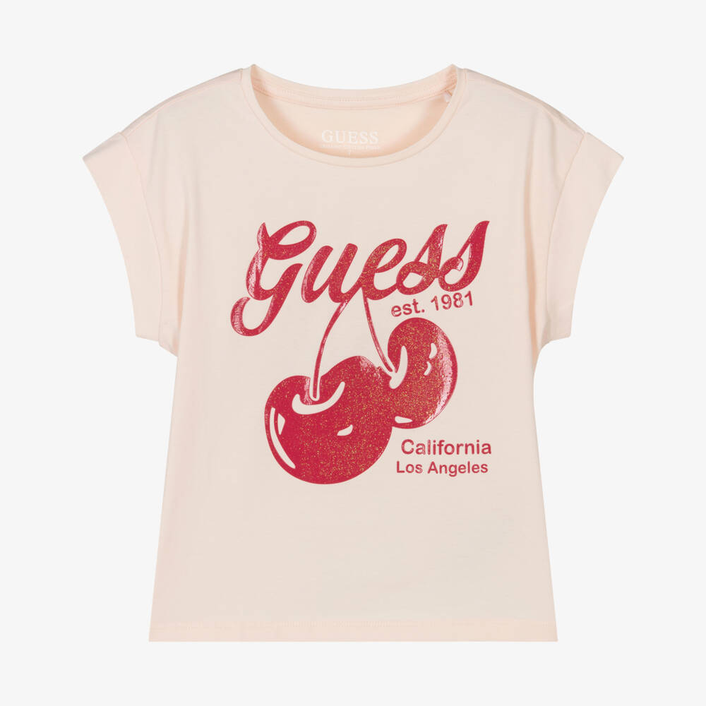 Pale pink T-shirt for junior girls by Guess, made with organic cotton. This jersey top has a glittery cherry design on the front in a deep pink shade. Rubberised logo lettering creates instant brand recognition.