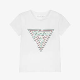 Junior girls white T-shirt by Guess, featuring a striking silver leopard print and heart logo print. Ideal for casual outings, it is made in soft cotton jersey, with a boxy fit and short sleeves.