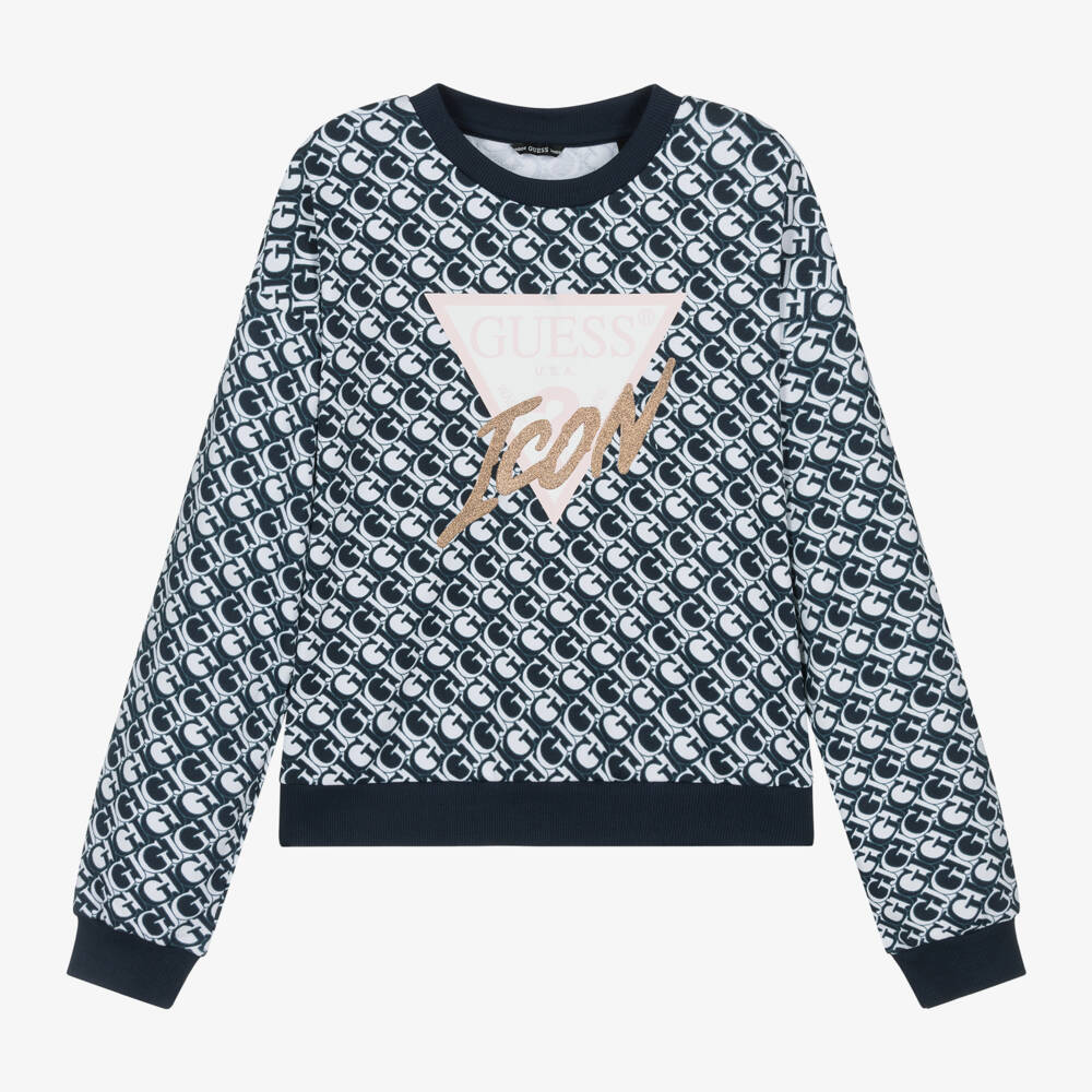 Navy blue and white sweatshirt for teen girls by Guess. This unmistakable designer style has a bold logo pattern print with the brand's signature Triangle motif in pink and white and 'Icon' in glittery gold print on the chest. A relaxed fit with dropped shoulders and long sleeves, it has ribbed trims to complete the casual look.