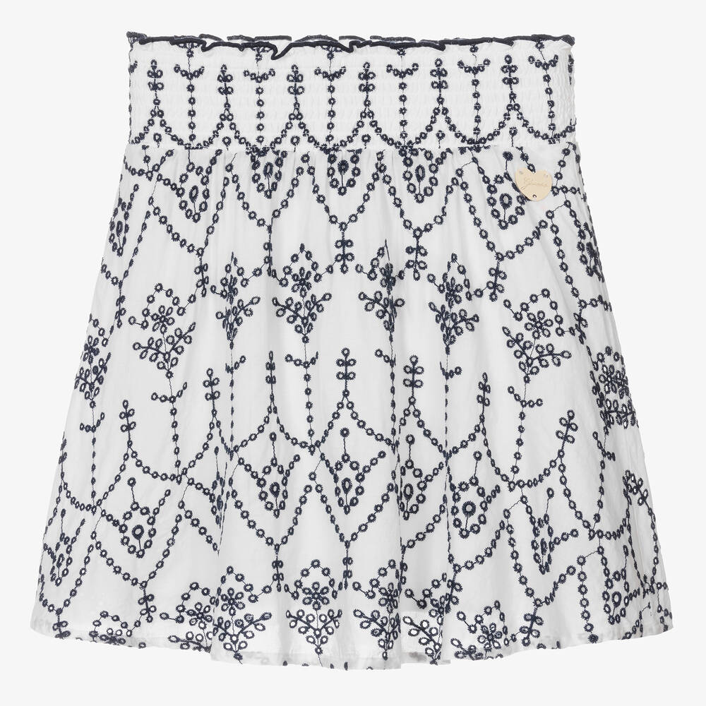 Beautiful white and navy blue broderie anglaise skirt for teen girls by Guess, with a gold-tone heart logo charm on the hip for a discreet designer touch. Made in soft and lightweight cotton and fully lined, this comfortable style has a wide, shirred elastic waistband.