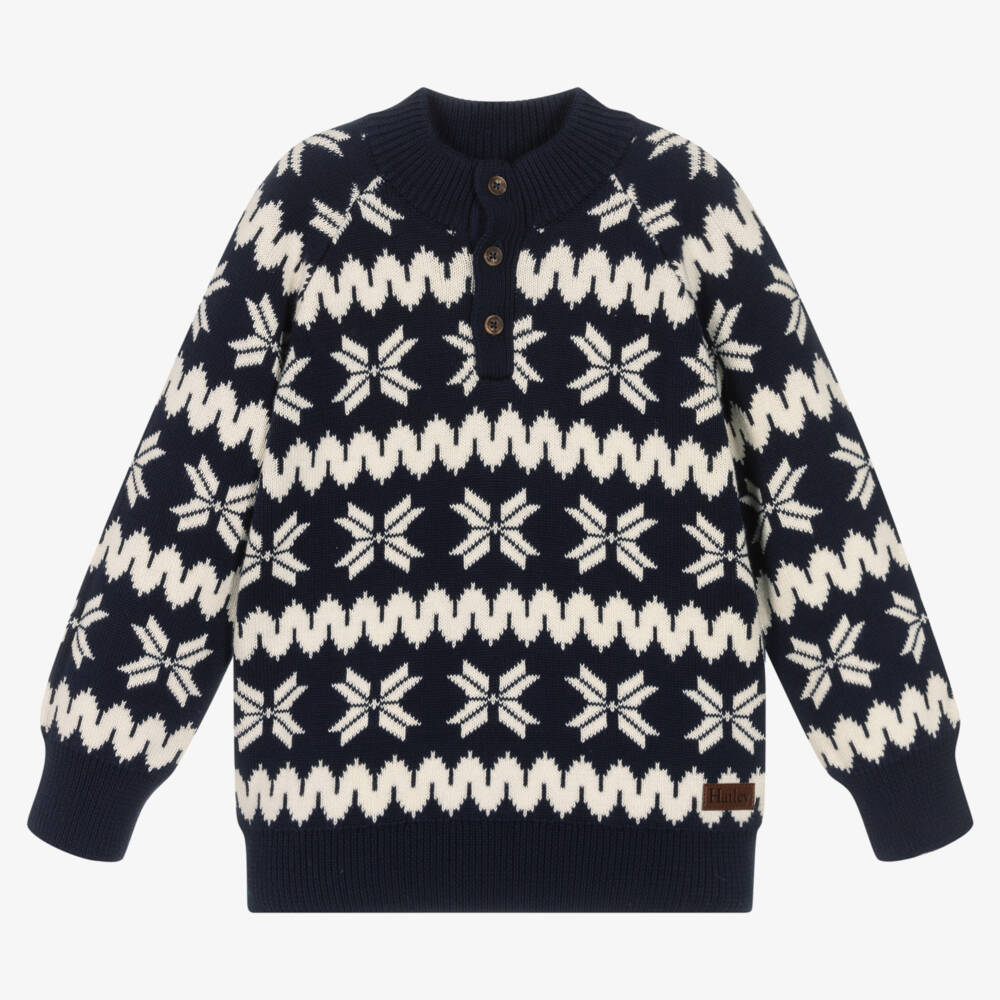 Navy blue and ivory turtle neck jumper for boys by Hatley with a stylish Fair Isle pattern. It has classic button fastenings on the front placket, with gently ribbed cuffs for a comfortable and cosy look. There is a small brown logo patch above the front hem for a subtle designer touch.