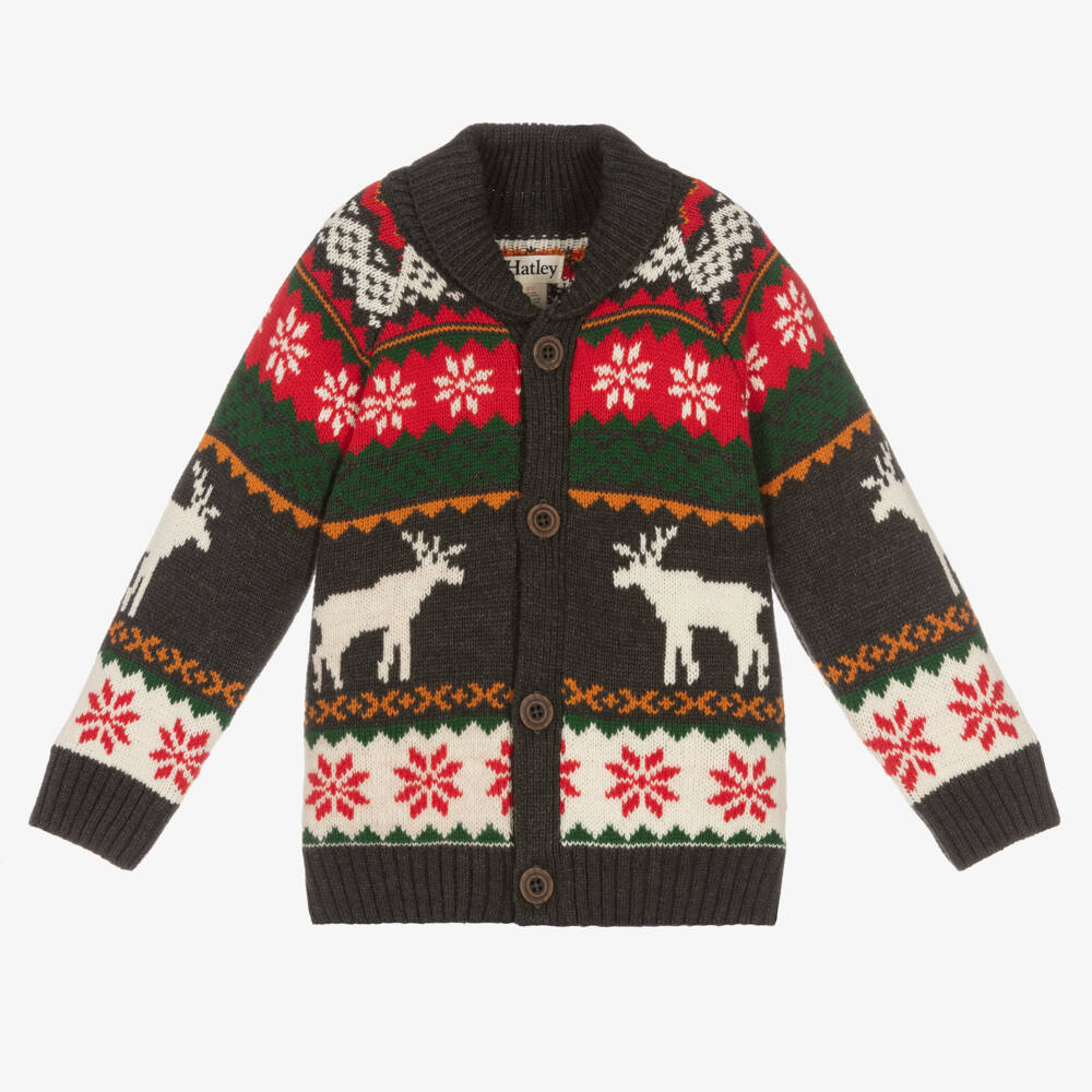 A grey, red and green cotton-blend cardigan for little boys by Hatley, patterned with festive motifs, including stags and snowflakes. Ideal for layering, this soft cosy knit cardigan has a shawl collar and wooden buttons for a classic look.