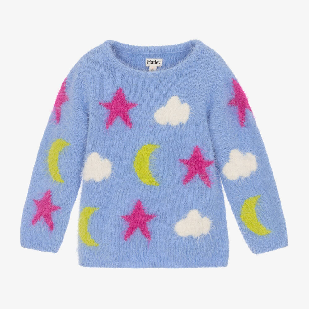 Lovely cornflower blue sweater for girls by Hatley, in a super soft and fluffy knit. It has a pink star, moon and cloud intarsia pattern for a cute look.