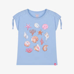 Aquamarine green top for girls by Hatley, made in soft cotton jersey with a marled tone. This sleeveless design has a pink palm tree printed on the front, with bright yellow stitching. It has adjustable shoulder detailing for a ruched effect.
