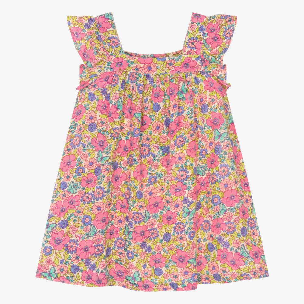 A charming pink dress for girls by Hatley, made in super soft, lightweight viscose. With a garden flowers and butterflies print in lovely shades of pink, blue and lime green, it has short flutter sleeves for a pretty look on sunshine-filled days.