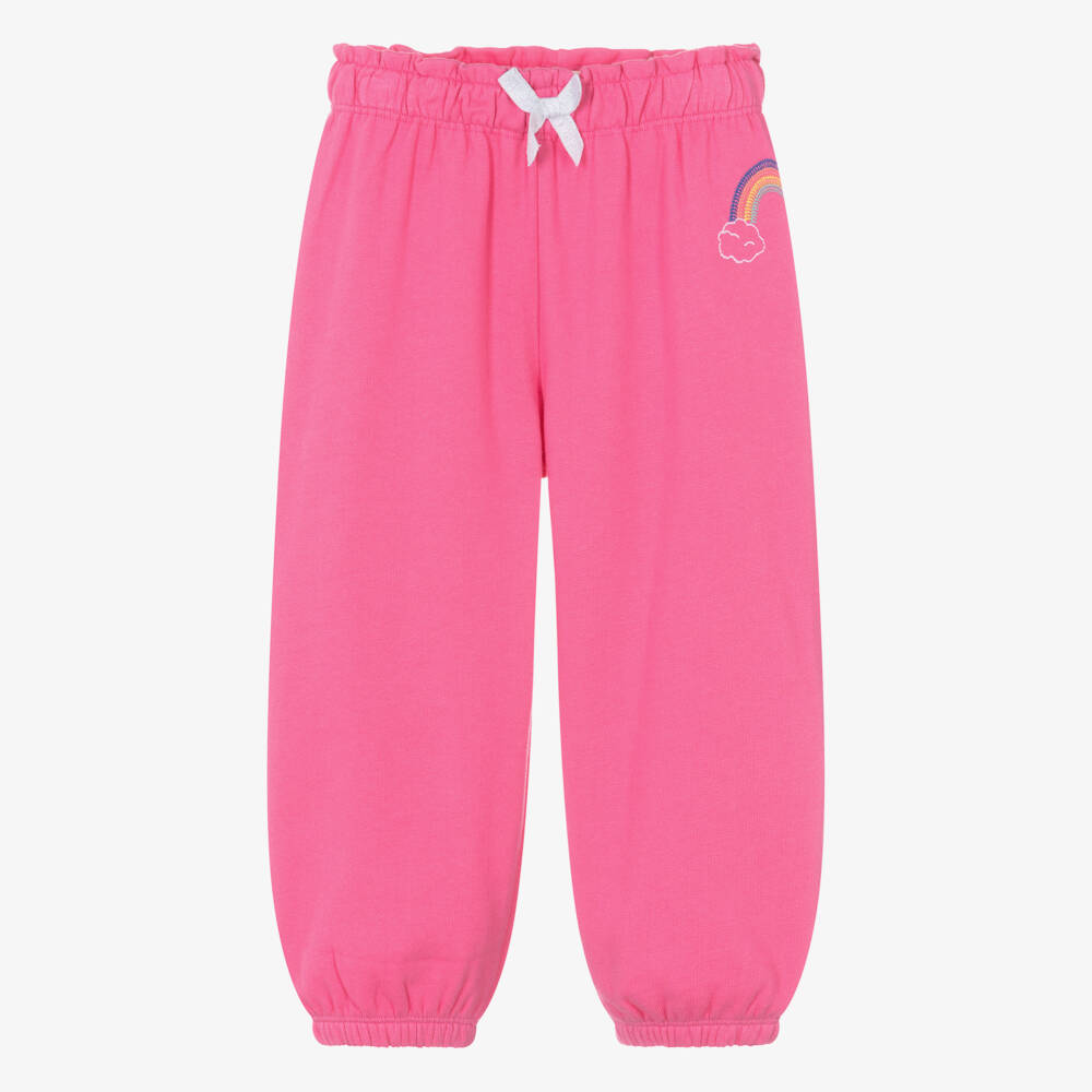 Pink joggers for little girls by Hatley, made from super soft cotton jersey. Cute and casual, they have a stretchy paperbag waist with a glittery decorative bow on the front. A colourful rainbow is embroidered on the side for a sweet finish.