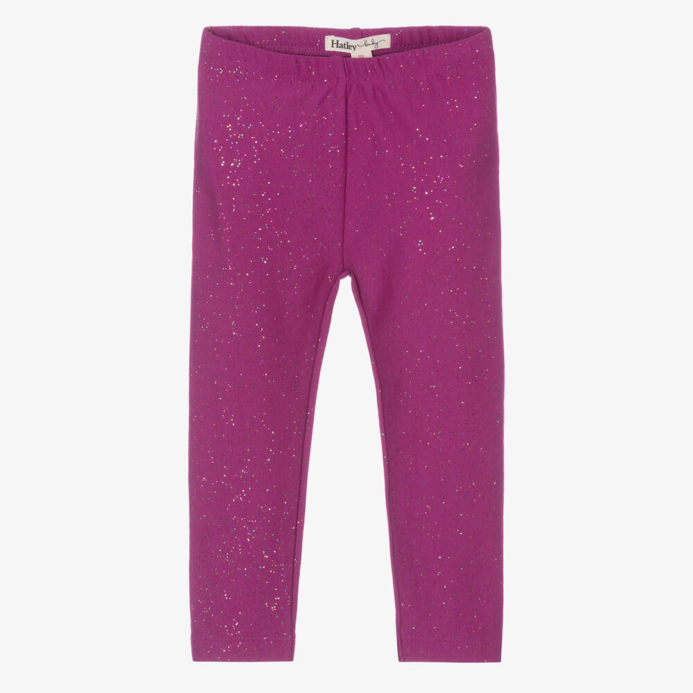Pretty purple leggings for little girls by Hatley, made from super soft and stretchy cotton jersey. Cute yet comfortable, they are decorated in shimmery specks of glitter, and have an elasticated waist.