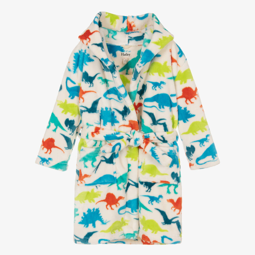 Super soft ivory fleece hooded dressing gown for boys by Canadian brand Hatley. Patterned with a colourful dinosaur print, in blue green and orange, it has two handy front pockets and ties at the waist with an attached belt.