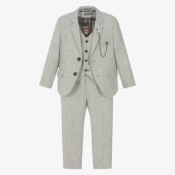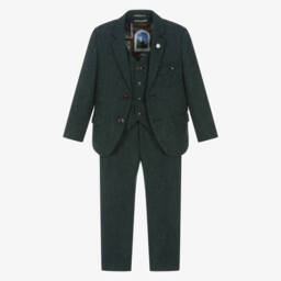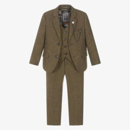 Olive green herringbone tweed Mini-me Thomas suit for boys by House of Cavani. Made in a soft wool blend, the set includes a single-breasted jacket with a stylish chain lapel pin, with a matching waistcoat and trousers. The trousers have front and back pockets and a partially elasticated waistband for a great fit. The jacket has a silky lining with a window pattern.