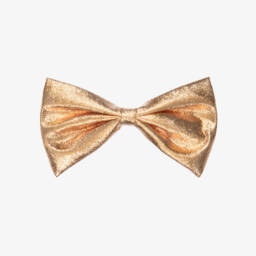 Pretty metallic amber gold bow hair clip for girls by Hucklebones London, made in glittery lamé fabric. Classic and understated, it secures with a metal crocodile clip.