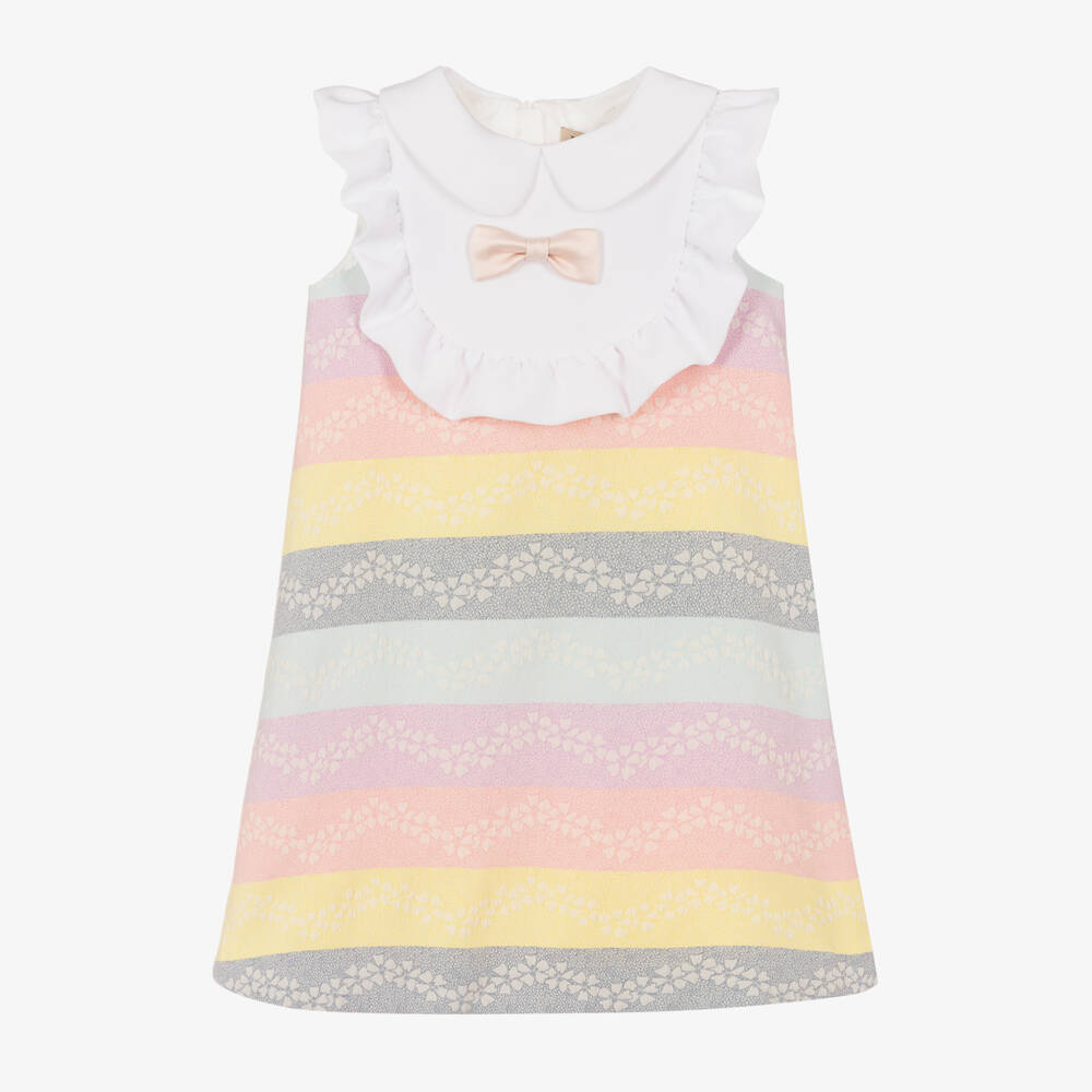 In floral pastel stripes of pink, yellow, blue and purple, this jacquard dress for girls is by Hucklebones London. The bodice has a white bib front, with a ruffle trim and blush pink bow. The silky satin lining provides comfort against the skin, whilst the concealed zip fastening gives a neat finish.