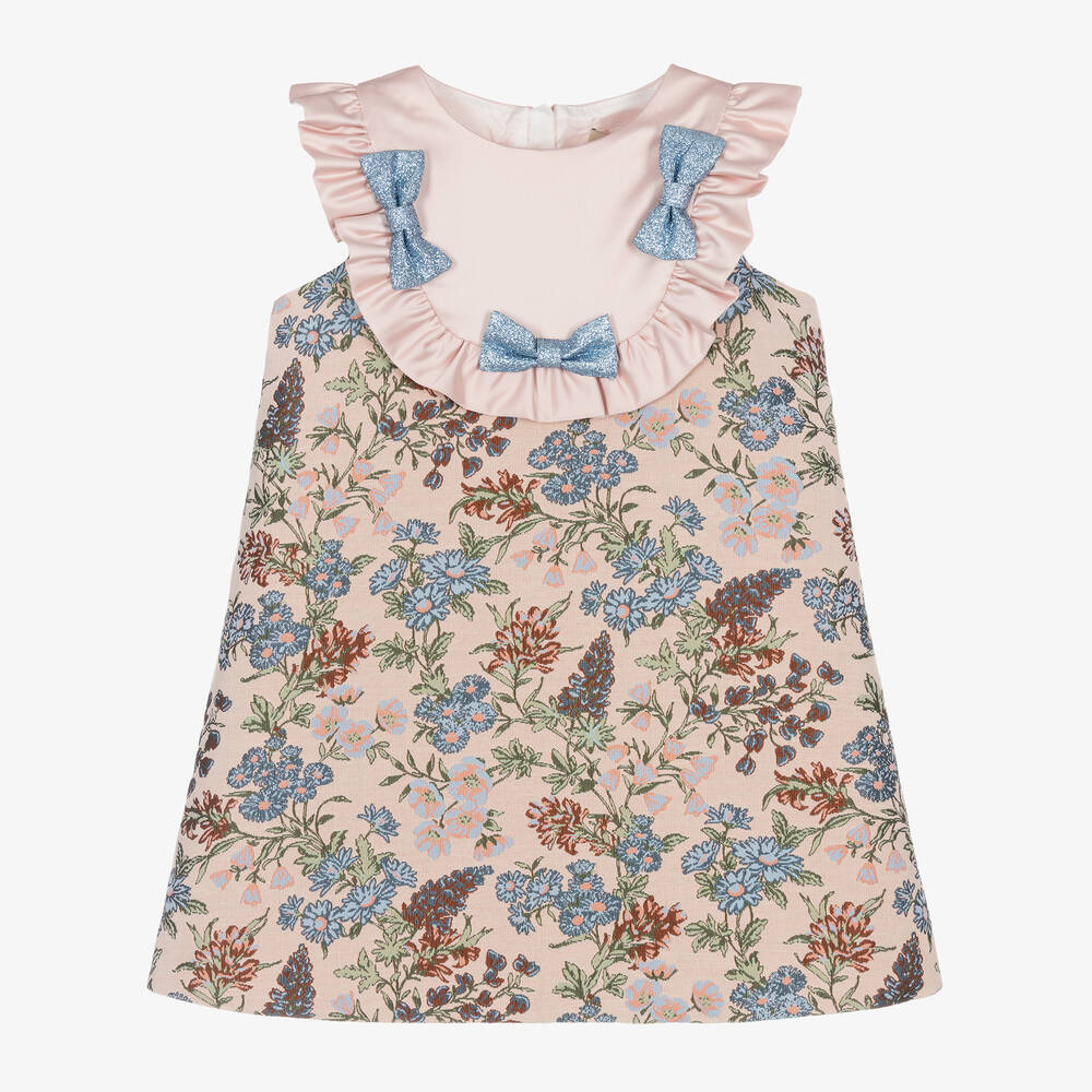 From Hucklebones London, a stunning pink cotton blend brocade dress for girls. With a large contrasting satin collar embellished with sparkly bows, this A-line dress is ideal for a special occasion.