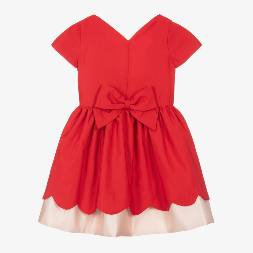Vibrant red dress for girls by Hucklebones London, made in soft, mid-weight cotton twill with a silky lining for added comfort. Lovely for a special occasion, it has pretty design details, like the scalloped hem, open back, and fixed bow on the front. The flared skirt is lined with tulle for volume, with pale gold satin trims visible below the hem.