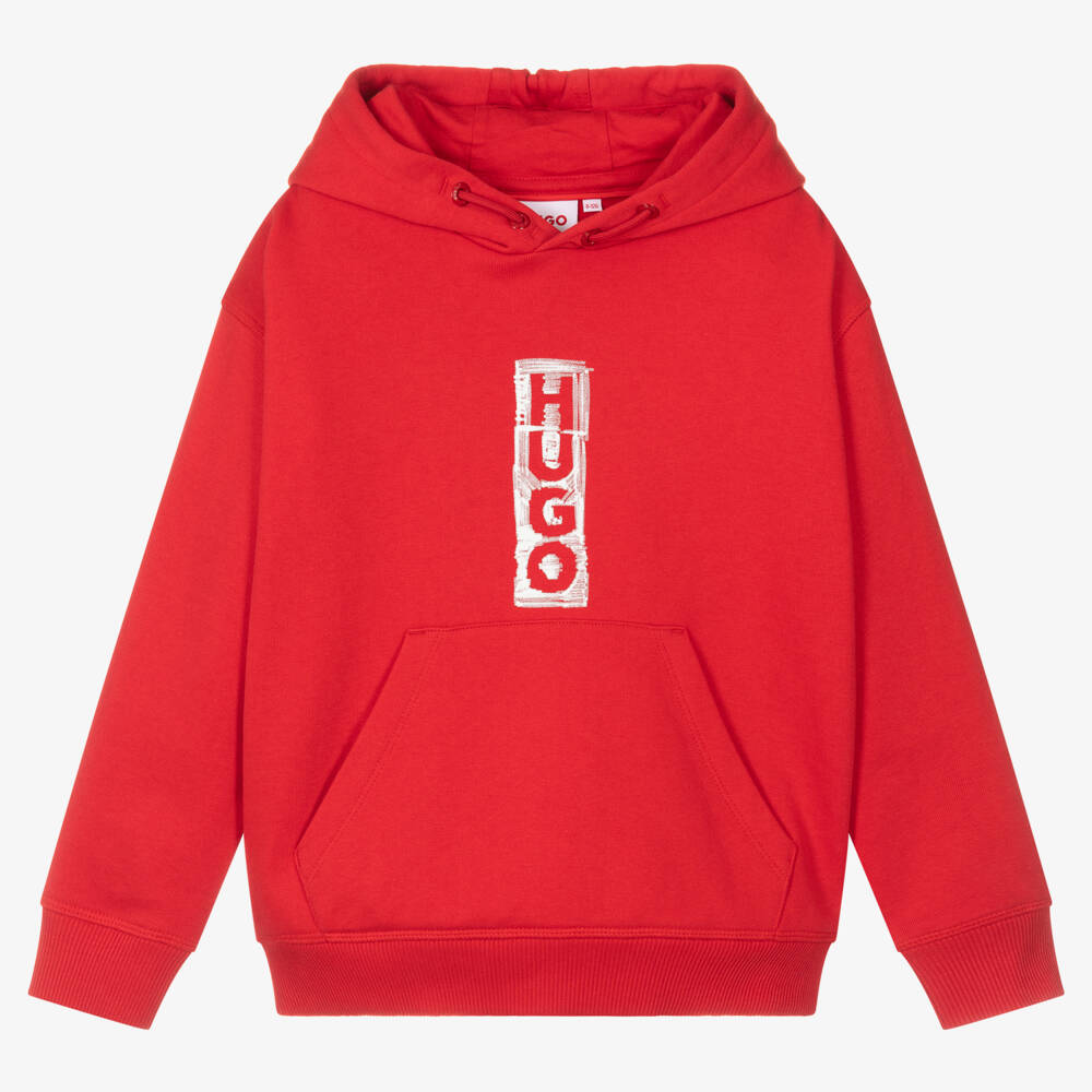 A red cotton hoodie for boys and girls by HUGO, made in soft mid-weight jersey, with a fleecy inside for casual cosiness. A distinctive white logo is printed in a marker-effect style on both sides, creating a cool, modern look. It has faux drawstrings on the hood, a pouch pocket, and sporty ribbed trims.