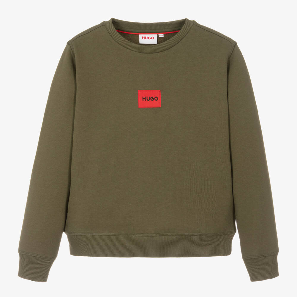 Displaying the brand's signature red and black logo patch on the chest, this casual khaki green sweatshirt for teen boys is by German designer HUGO. Made in a mid-weight cotton blend jersey with a fleecy inside, this regular fit top has a crew neckline and cosy ribbed trims.