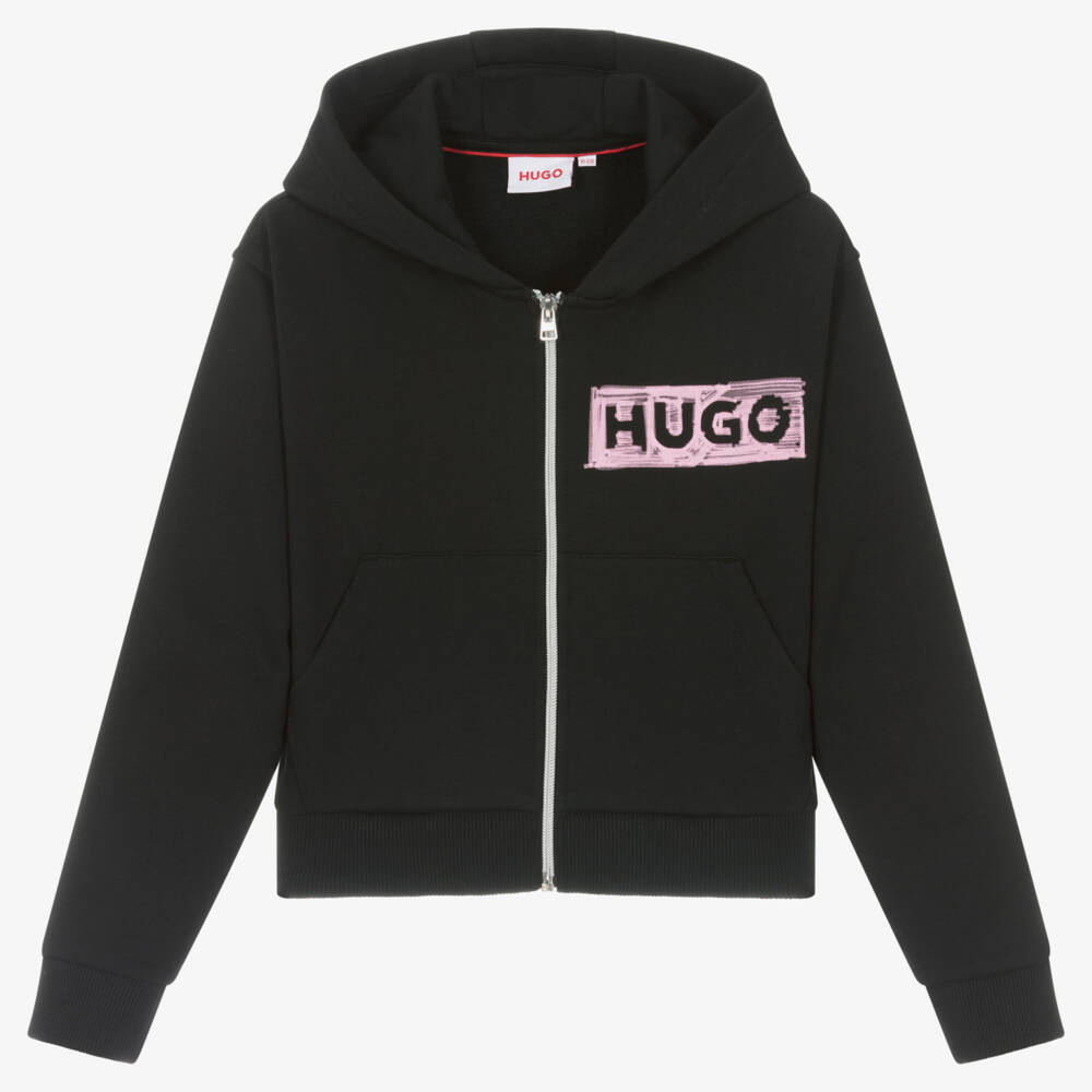 Casual black hooded zip-up top for teen girls by HUGO, with eye-catching pink marker logo prints on the front and back. Made in comfortable cotton jersey with a cropped, boxy fit, it has a pouch pocket on the front and soft, ribbed trims.