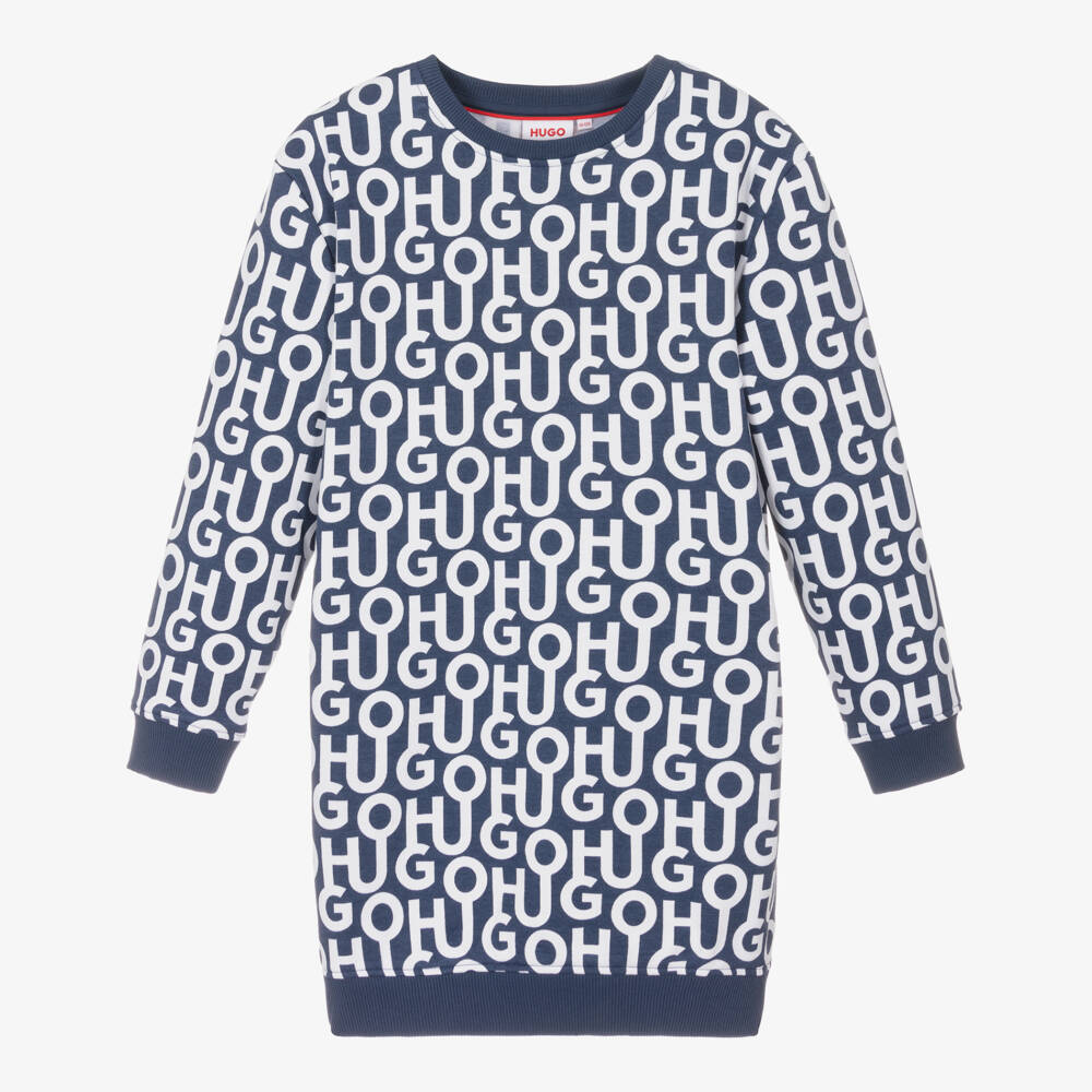 Patterned in a bold white logo print for a distinctive look, this blue sweatshirt dress for teen girls is by HUGO. A great addition to her casual wardrobe, it is made in comfortable cotton-blend jersey, with a soft fleecy inside and cosy ribbed trims.